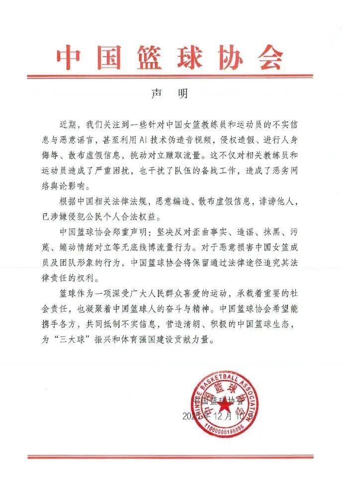 2025年12月11日针对中国女篮教练员和运动员的不实信息与恶意谣言,中国篮协发布声明