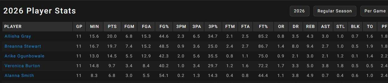 从数据面板看,35岁的斯图尔特场均出战16.7分钟,格雷也有15.6分钟。 球队需要李月汝做的,可能更多是在特定时段利用身高守护篮筐,而非作为主攻点。 这种功能单一化的角色定位,让她的出场时间变得零碎而不可预测。 对比她上赛季在WNBA的场均篮板数据,如今在无敌联赛的贡献确实有限。