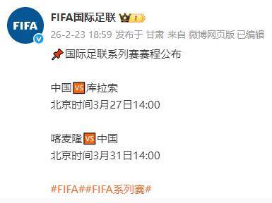 近日,国际足联官方公布了2026年国际足联系列赛的详细赛程,中国男足的比赛时间也随之确定。根据安排,中国队将在3月下旬迎来两场国际友谊赛,对手分别是库拉索队和喀麦隆队。邵佳一接手国足以来的首次正式亮相即将到来。
